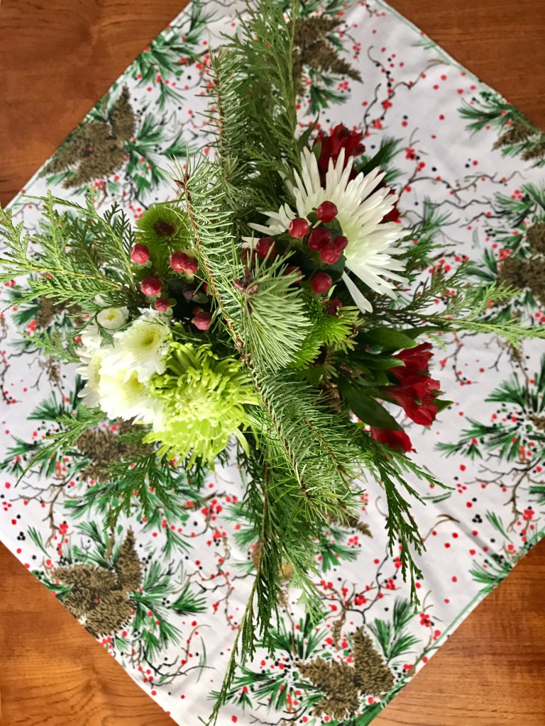 I knew I wanted some sort of a centerpiece for our dining room table, but I didn’t realize it would be so easy to put together. I picked up this festive square of fabric at a vintage market. It’s from Z Amore in Minneapolis. Then I simply got some flowers and greens, arranged them in a vase, and placed some old pine cones I had from several years ago around the arrangement. It looks great and was so simple to put together.