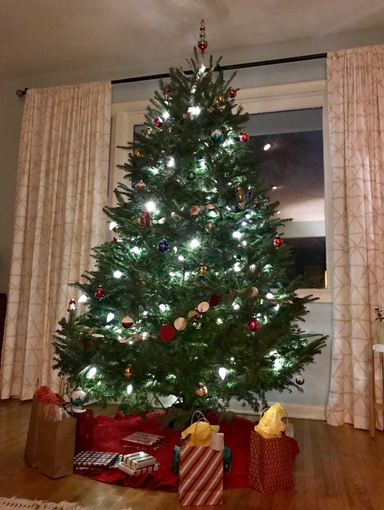 We bought our tree from a local farm that had a lot near our house. Picture us walking down the street with tree in hand, neighborhood dogs barking, and neighbors wondering what’s happening. We picked out a Fraser Fir, one of my favorite trees, and decked it in new (vintage looking) and vintage glass ornaments.