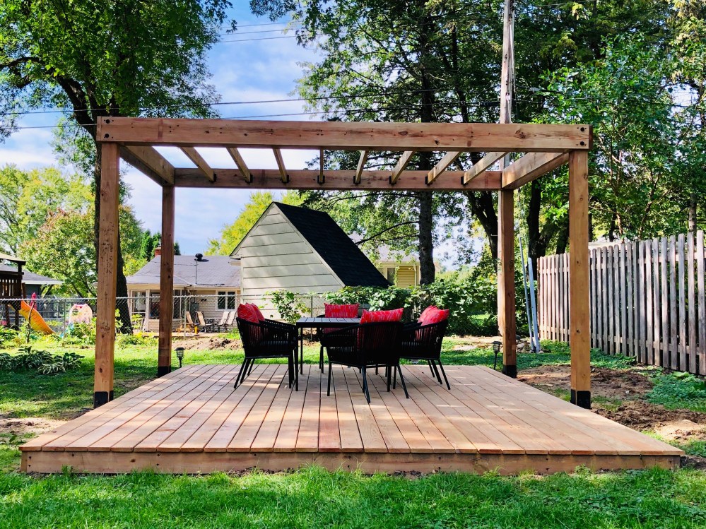 The pergola is off-center on the deck because we have more plans for the right-side area.